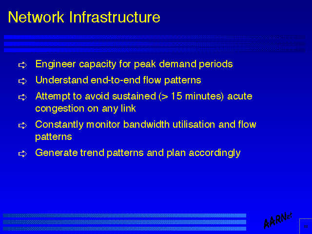 It is also necessary to understand end-to-end flow patterns, and engineer minimal delay paths and adequate capacity to support such flows. Here a typical profile of end to end flows within many national infrastructures does conform within some level of approximation to population centres, although with the capacity of desktop workstations to generate megabit flow demands particular user programs may distort this pattern.