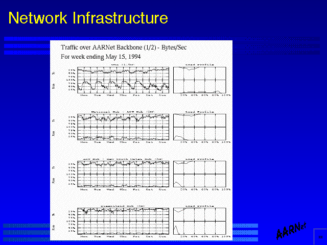 Indicated in this figure is the topology of the Australian network engineered by the author, as of December 1993. The cost constraints, and the reliability factors of the circuits, routers and operational environments has allowed the network to be configured as a minimal spanning star trunk topology, feeding regional access hubs which are client connector points, using carrier provided leased dedicated circuits for the trunk network.