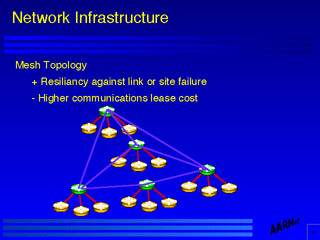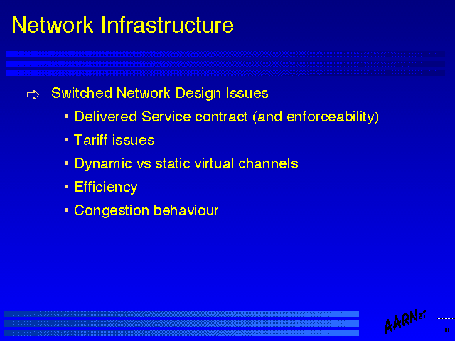 The issues associated with network design across shared switching infrastructure are somewhat different to dedicated circuit design issues. Within a switched infrastructure topology considerations are much less relevant as a design issue in so far as new circuits can be configured, and removed, with ease, and although current routers do not bring up a new circuit automatically (as this is typically a configuration issue which does entail additional expenditure the task is generally a manual configuration task as a consequence.