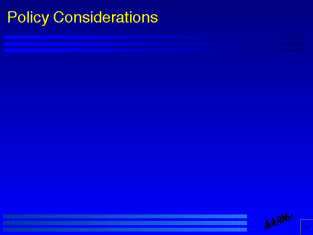 The general consideration is the policy model for the construction of a national Internet network service. The "traditional" model (if traditions can be considered as traditions even if they are less than five year old experiences!) is that a national Internet service starts out as a university-sponsored academic and research facility with strong governmental involvement, and little support from the national telephone communications operators. This then attracts other research players within the country, which in turn widens the brief of the facility, and places government money in a lose confederation with industry-based research funding. The third step is the increasing level of interest by other sectors, and typically the result is the genesis of other network service providers, as the constraints imposed by the publicly-funded facility typically preclude commercial activities, and often noted in conjunction with this step is the belated visible interest on the part of the telephone companies to be involved in this area of the communications business.