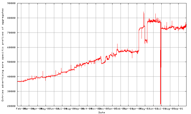BGP table size data for the first half of 2001 shows different trends at various measurement points in the Internet. Some measurement points where the local AS has a relative larger number of more specific routes show a steady state for the first half of 2001 with no appreciable growth, while other measurement points where the local AS has had a lower number of more specific routes initially show a continuation of table size growth. There are a number of commonly observed discontinuities in the data for 2001, corresponding to events where a significant number of more specific entries have been replaced by an encompassing aggregate prefix.