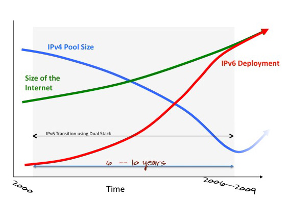 The detailed progress of a dual stack transition is somewhat uncertain, as it involves the individual judgment of many actors as to when it may be appropriate to drop all support for IPv4 and rely solely on IPv6 for all connectivity requirements. However, one factor is constant in this envisaged transition scenario, and whether its dual stack in hosts, or dual stack via NAT-PT, or various combinations thereof, there is the consistent requirement that there are sufficient IPv4 addresses to span the entire Internet's addressing needs across the complete duration of the dual stack transition process. Under this dual stack regime every new host on the Internet was envisaged to need access to both IPv6 and IPv4 addresses, in order to converse with any other host using IPv6 or IPv4. Of course this approach works for as long as there is a continuing supply of IPv4 addresses, implying that the timing of the transition was such that it was meant to have completed by the time that IPv4 address exhaustion was going to happen, as indicated in Figure 7.