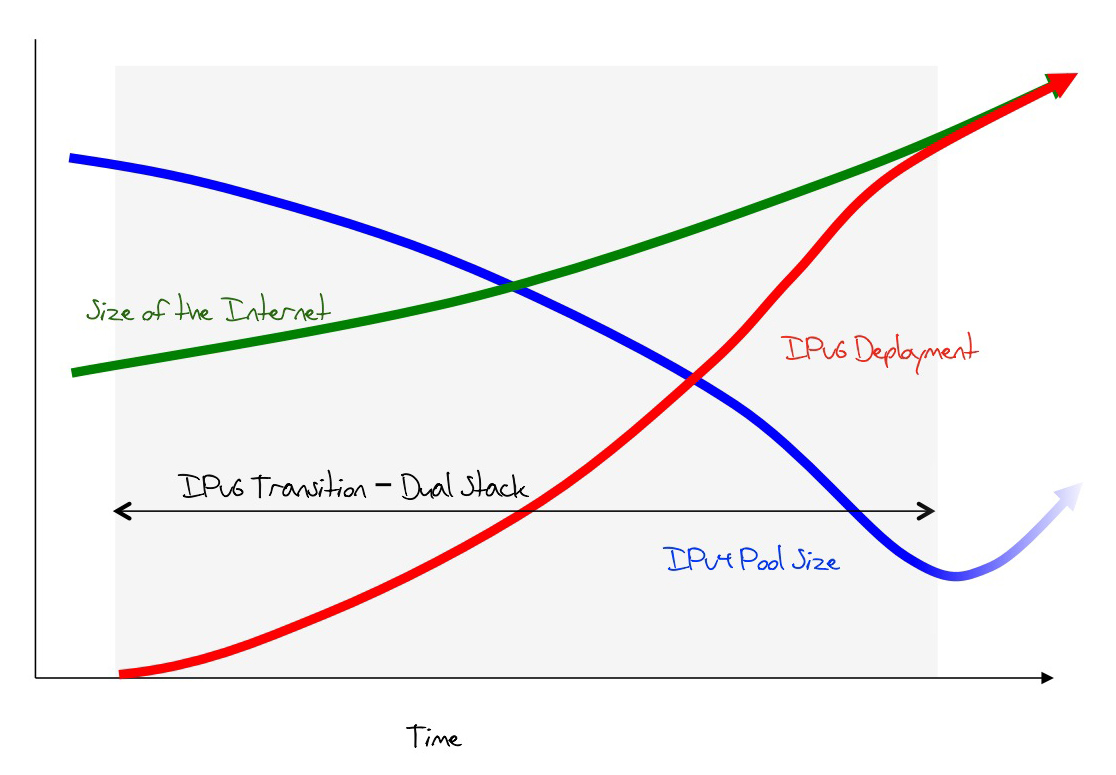 The corollary of this dual transition plan is that, ideally, it needs to be complete before we exhaust the pool of IPv4 addresses that we will need to support the continual expansion of the Internet.