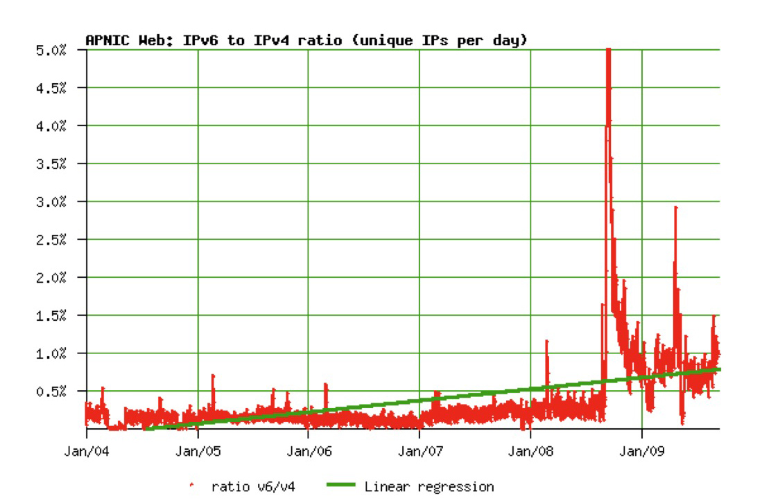The next task is to put the current date into the process. How far are we with the level of IPv6 deployment? There are a number of ways we can measure this (these have been discussed at http://www.potaroo.net/ispcol/2008-04/ipv6.html). In a small scale controlled measurement of IPv6 end-to-end deployment, the APNIC web server (http://www.apnic.net) has gathered data on the number of unique IPv4 and IPv6 addresses that have accessed the site each day since 2004. On the assumption that end hosts will prefer IPv6 over IPv4 as long they are equipped to handle IPv6 and as log as some form of IPv6 transport is available, the long term data of the ratio of IPv6 to IPv4 access provides a reasonable window on the true level of permeation of IPv6 deployment across the population of end user sites. This data is shown in Figure 4. (The increase in the ratio in September 2008 though to early 2009 was due to a prominent listing of this web site on a Chinese academic and research network's IPv6 links page.)