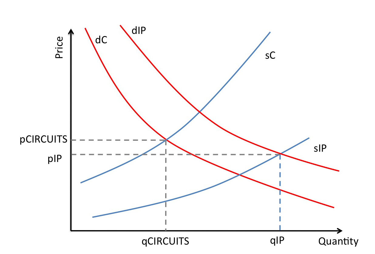 In economic terms this Internet-induced shift can be modelled as a supply curve shift, where the cost of the provision of upper level data services was drastically reduced thorough the use of IP placed on top of the basic bit carriage services. If the supply side was able to respond to this opportunity then this lower price would result in an increase in quantity of service at the equilibrium point of the new price. At the same time the extremely simple and flexible model of service delivery in IP allowed for a entirely new set of applications for data networking. This was first seen in the rise of electronic mail, then with file sharing and very quickly to services that were built upon the emerging common substrate of the worldwide web. This dramatic expansion of the service portfolio increased the user's perceived value of the service, which can be modelled in the demand schedule as a demand curve shift within the framework of the same basic economic model.