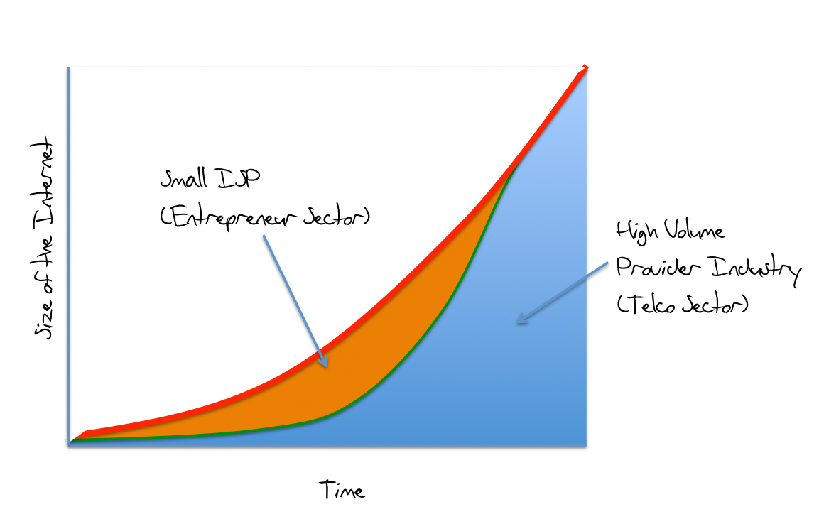 This is not a long-term stable situation, particularly in the telecommunications services sector which is characterised by significant economies of scale. The increasing intensity of competition in a marketplace occupied by a set of small scale providers lead to a wave of consolidation in the nascent ISP industry, where the smaller players merged into larger enterprises that were then able to use their resultant greater volume of activity to achieve greater economics of scale.