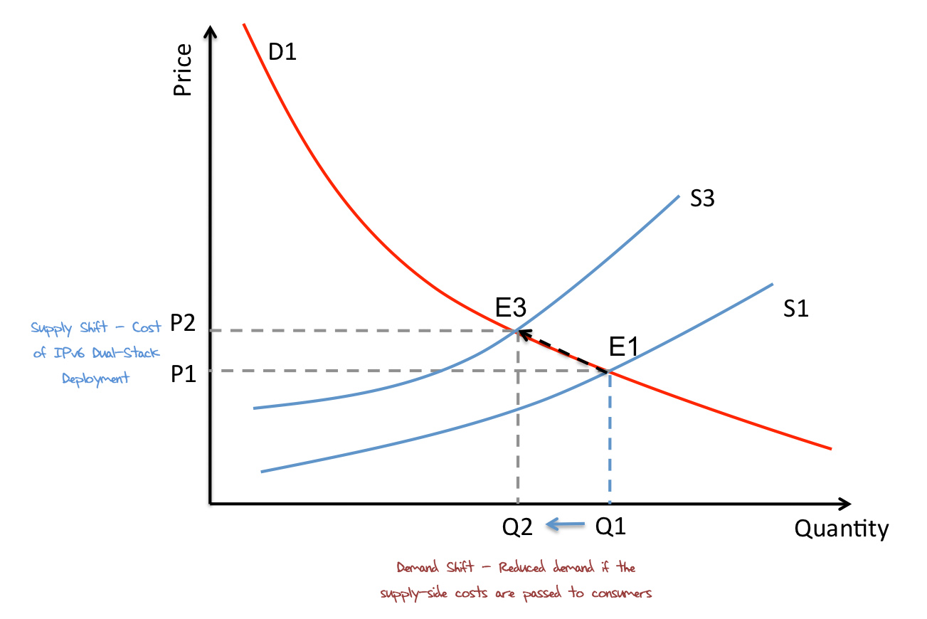 In summary, there is no consumer-visible difference in the services provided by IPv6 that would lead to a change in demand, and nor is there a difference on the cost of production of services that would lead to a change in supply. And because IPv6 is not backward compatible with IPv4 the two goods are not perfect substitutes. Instead, there is a cost associated with the provision of IPv6 related to the cost of the provisioning and operating the network infrastructure with IPv6 support.