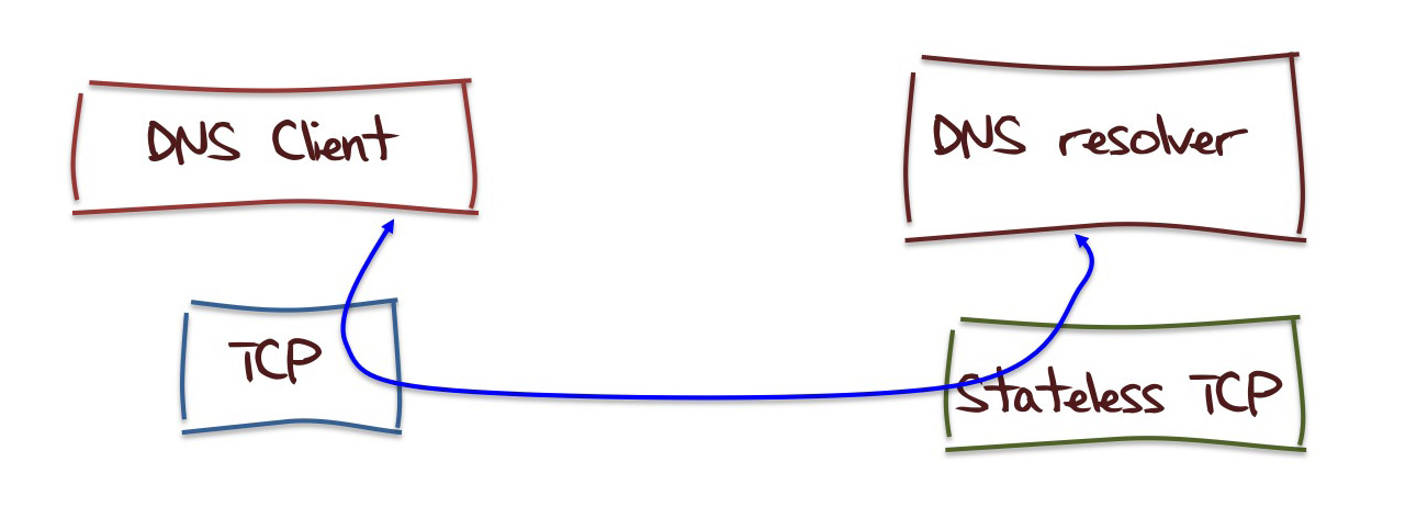 This has much the same properties of the hybrid model, and just could be coerced into working. But then again I'm not keen to start hacking around inside an implementation of a DNS server, so the fastest way to prototype this approach is to put in a TCP / UDP translator between the client and the server: