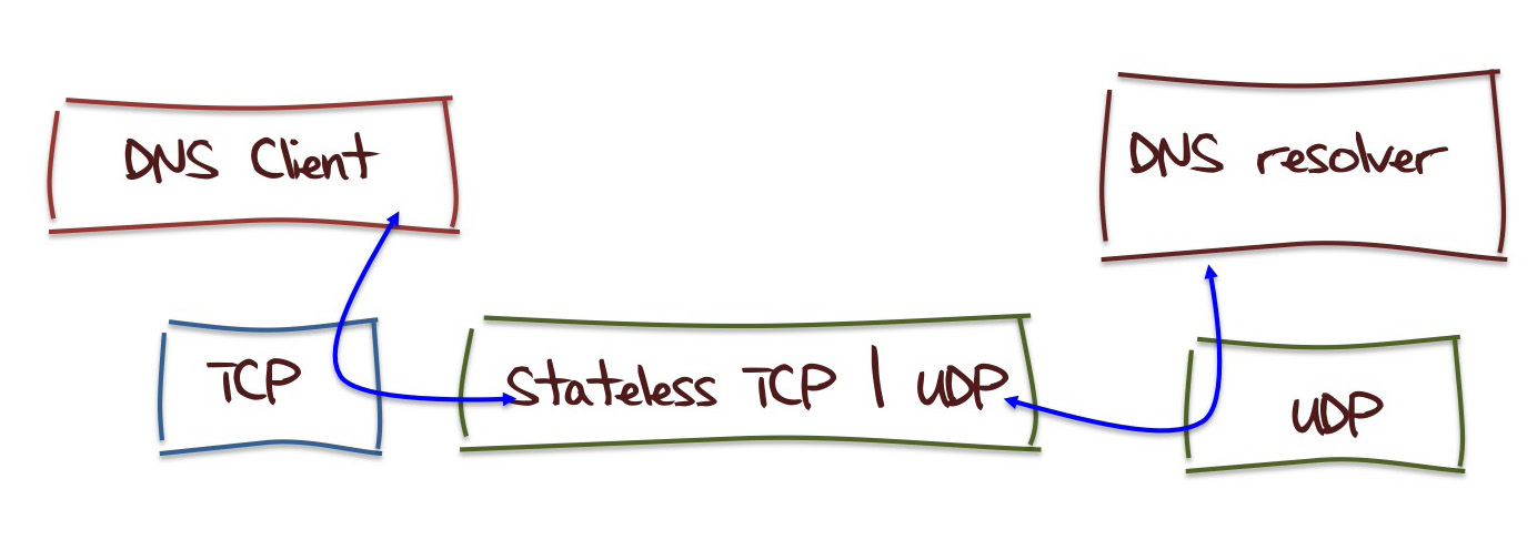 [The stateless server rephrases the query as a UDP query against a backend DNS