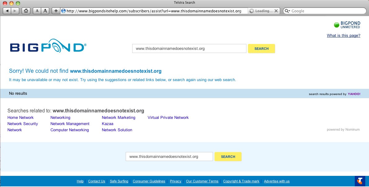 "The BigPond-branded landing page provides BigPond customers with organic search results, sponsored links, display advertisements and intelligent recommendations, all derived from the invalid domain input - much more helpful and friendly than a nasty 404 page error."