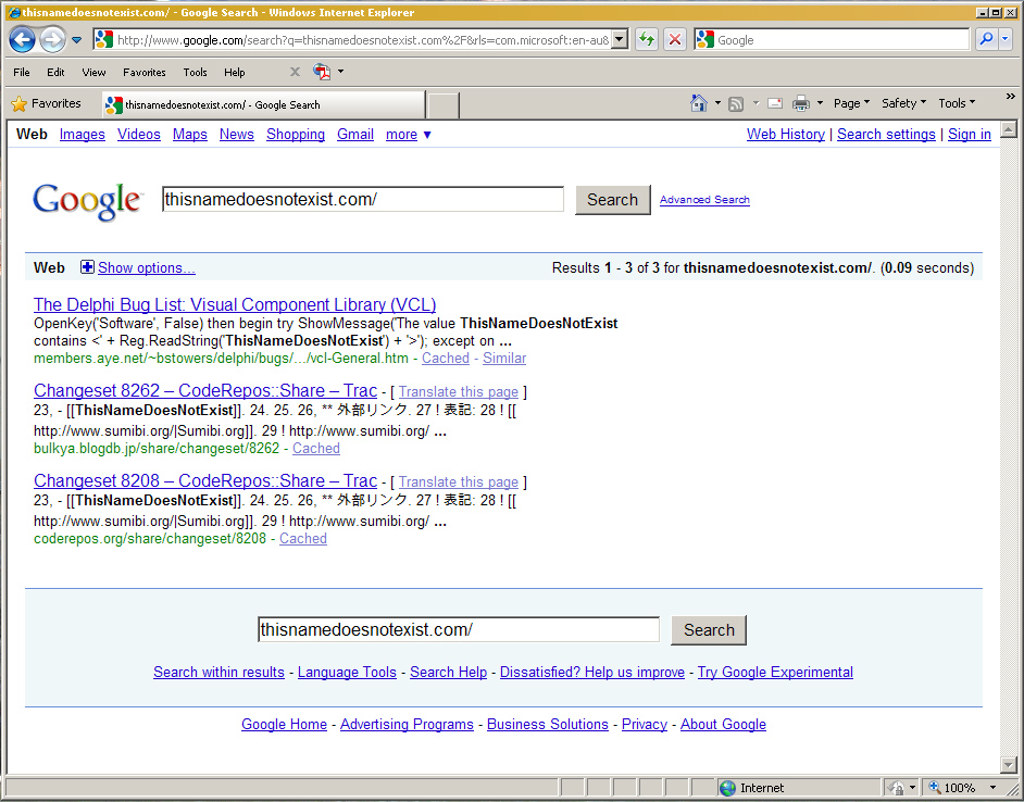 As an aside, I thought that for completeness it would be good to reproduce the actions that Windows Explorer takes on an NXDOMAIN response. If you just enter a non-existent domain name into the address bar Explorer will provide a search results page based on the search provider you've configured into Explorer.