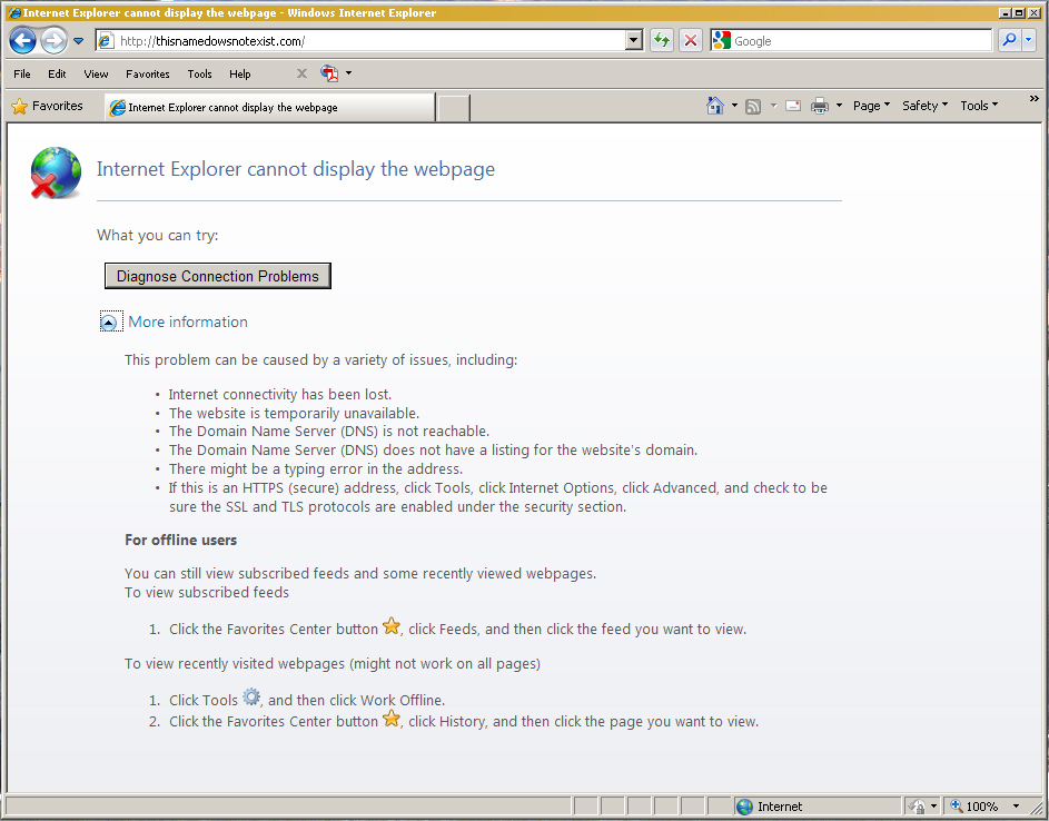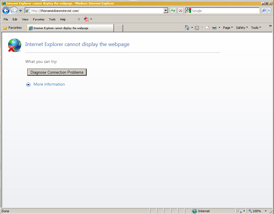 But if you enter a well formed URL into Explorer, such as http://thisnamedoesnotexist.com, then you get a somewhat more cryptic screen, where the set of hints shown in "more information" is not completely helpful.