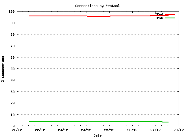 In terms of the profile of connections measured in this experiment, on average over the last 7 days in December 2010 this site's web server is contacted by an average of some 22,000 unique source addresses per day. Some 96% of the source addresses are IPv4 addresses, and 4% are IPv6.