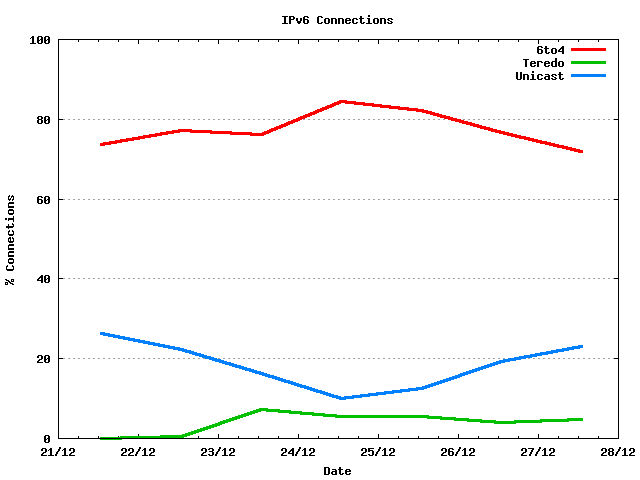 Of the V6 connections, only some 18% of the V6 connections are non-tunnelled. 78% of the connections, or some 600 unique sources out of an average of 875 IPv6 connections per day, use 6to4. only 4% of the connections, or an average of 40 unique sources, used Teredo.
