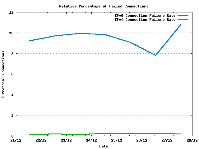 The significant level of disparity between IPv4 and IPv6 is quite evident when looking at the relative failure rate of the two protocols. Some 0.2% of the IPv4 connection attempts fail, whereas some 9.5% of the IPv6 connection attempts fail.