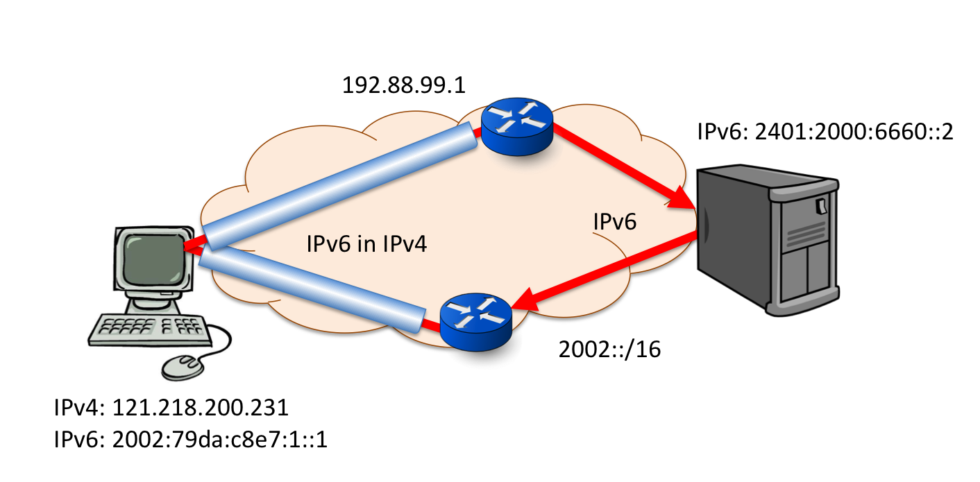 The 6to4 protocol is an auto-tunnel protocol that uses IPv6-in-IPv4 encapsulation to connect 'islands' of IPv6 to the IPv6 Internet. The encapsulation is a standard form of protocol 41 encapsulation (RFC 2473), where a single 20 octet IPv4 packet header is prepended onto the IPv6 packet. 6to4 relies on 2 relays: one on the 'outbound' path, where a 6to4 gateway takes incoming 6to4 packets (IPv4 packets with an IPv6 payload), strips off the IPv4 header and forwards the IPv6 packet, and one on the 'return' path, which takes incoming IPv6 packets, and adds an IPv4 wrapper, generating the IPv4 destination address from the 6to4 IPv6 address (Figure 6).
